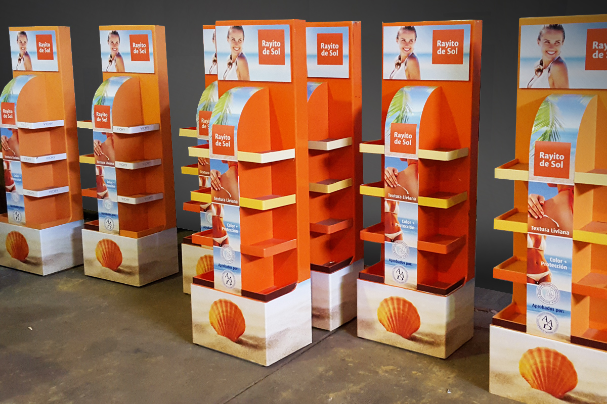 Ploteamos los exibidores para los productos de la marca Rayito de Sol. Impresión en vinilo. Excelente calidad. Decoración para puestos de venta. Los totems son una buena opción a la hora de destacar tu producto entre las góndolas.